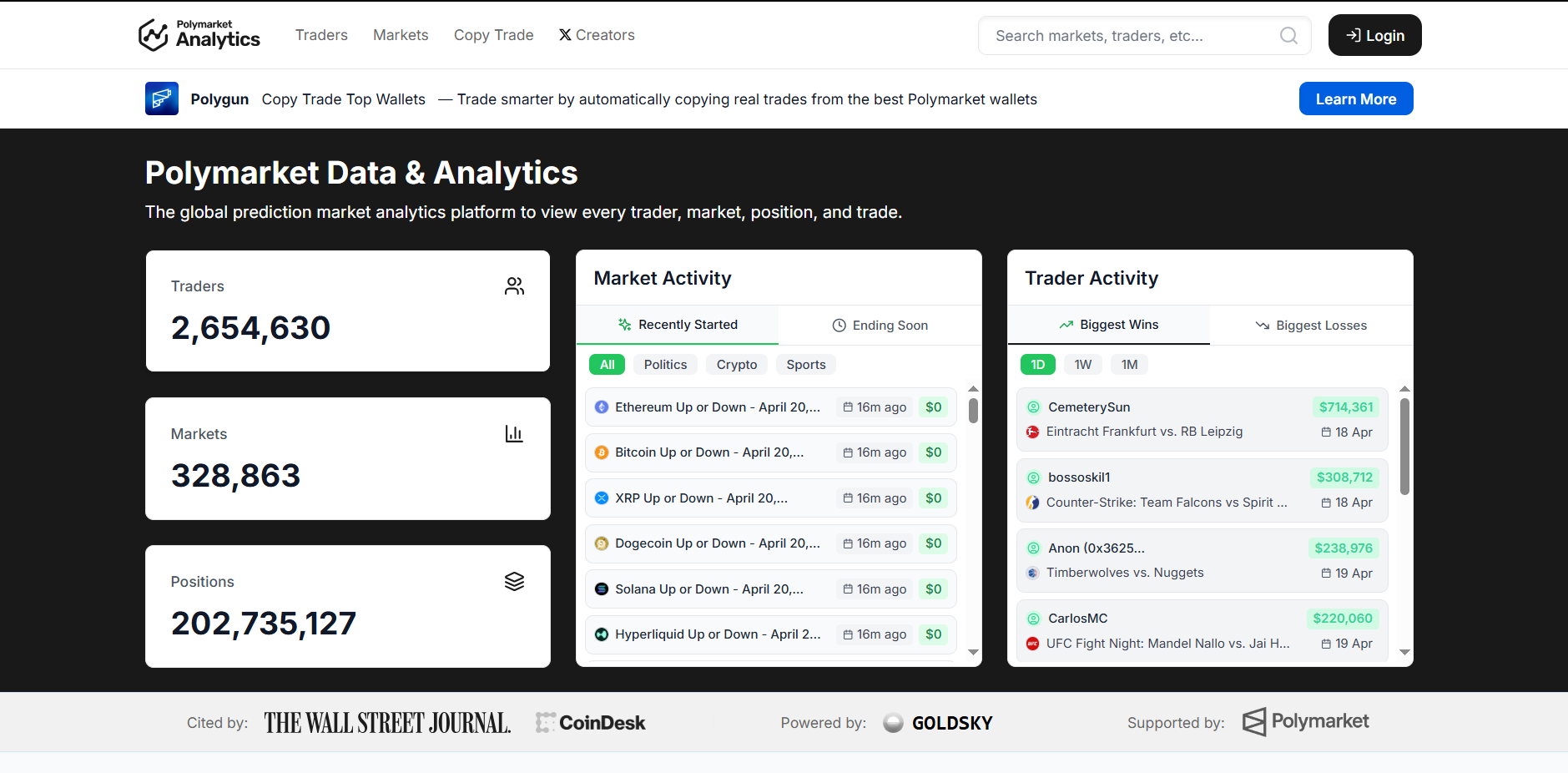Because Polymarket hosts a wide range of markets across politics, crypto, and global events, analytics tools built around it provide insight into how traders price future outcomes.