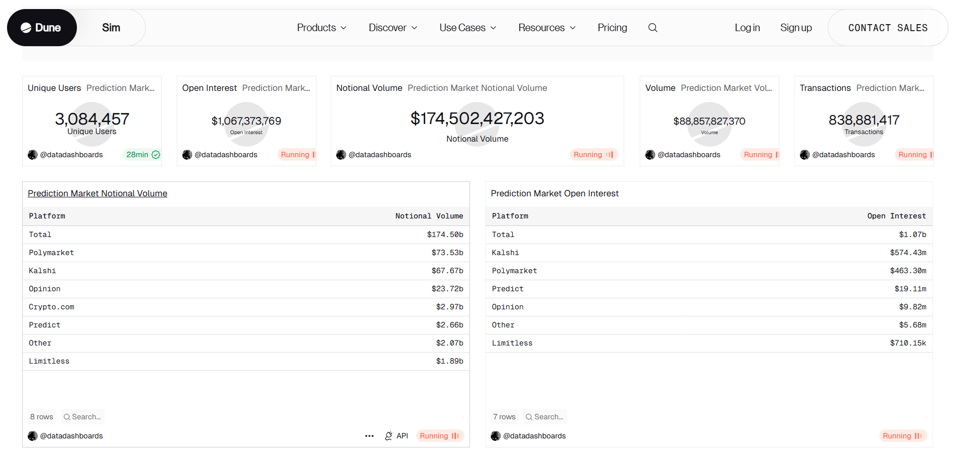 Many prediction markets operate on-chain, which makes Dune useful for analyzing: